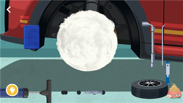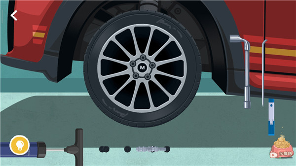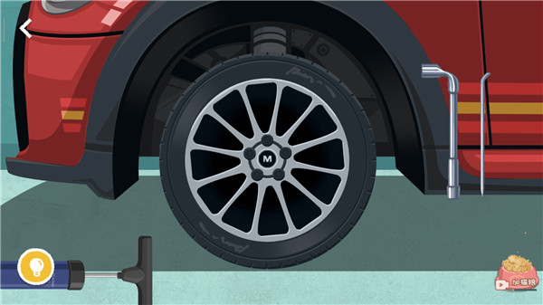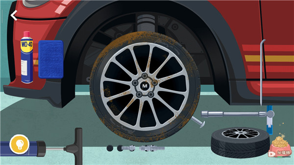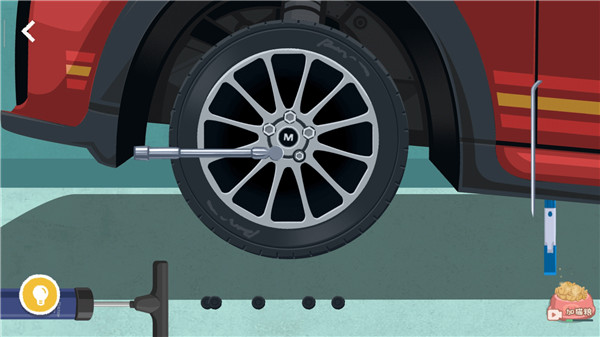 1、【完美备胎】关卡首先用细条工具将轮胎上的黑色东西卸下来,然后转动扳手将螺丝拧下来。