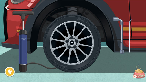 6、最后用左边的打气筒给车胎打气,即可成功通关。