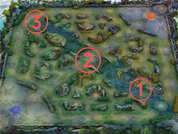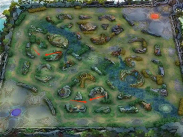 在20分巨人还没到中路时,自家有蓝buff可以提前蹲草,无蓝buff就到对方蓝区蹲草(红圈处位置)