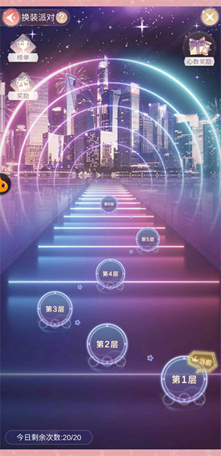 派对为时装比拼类型,根据每个关卡的要求穿戴相应类型额服饰即可增加分数,分数超过通关条件时即可通过,超出分数越多通关星级越高,最多3星。