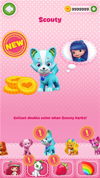 3、Scouty,蓝色的小狗,解锁需要3450的金币,和它对应的公主同样也是蓝色衣服和头发的,在一起的时候同样也是能够让我们的所得金币双倍。