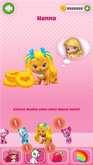 4、Wenna,黄色的小狗,解锁需要花费3950的金币,另外跟它对应的公主是黄色衣服和头发的公主,效果和之前的小狗一样也是让金币加倍。