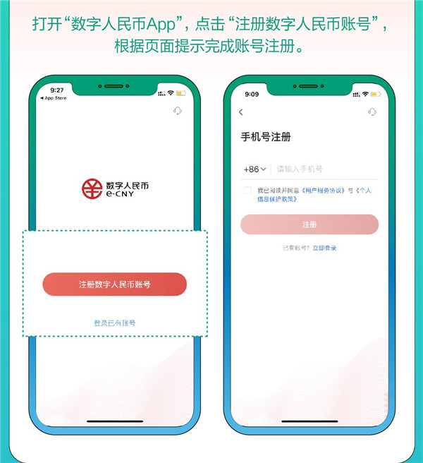 1、注册账号:打开已下载的“数字人民币APP”,点击“注册数字人民币账户”,根据页面提示完成账号注册;如已注册过数字人民币APP并遗忘登记密码,可点击“忘记密码”重置登录密码。