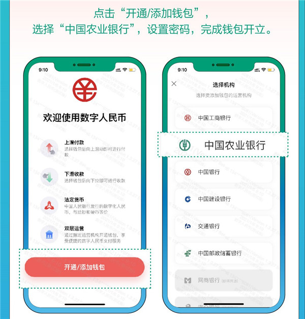 2、开立钱包并查询红包:点击“开通/添加钱包”,选择中国农业银行,设置密码,完成钱包开立即可查看红包;如已有他行数字人民币钱包,左滑屏幕,直至出现“+”号,点击添加农行钱包即可。