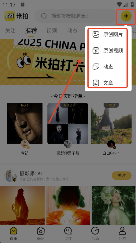 用户们也可以点击右上角加号,通过上传原创图片,文章或者视频,和其他爱好者分享自己的作品或者摄影经验